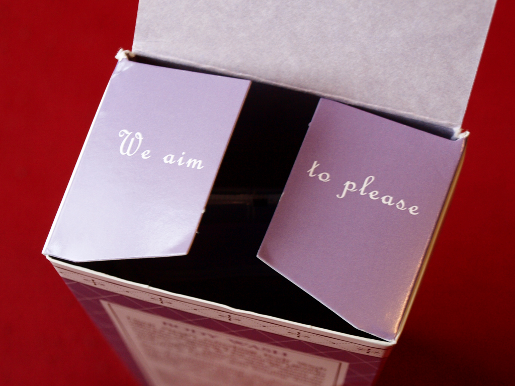 | One last picture — I love the “We aim to please” on the box flaps! |
