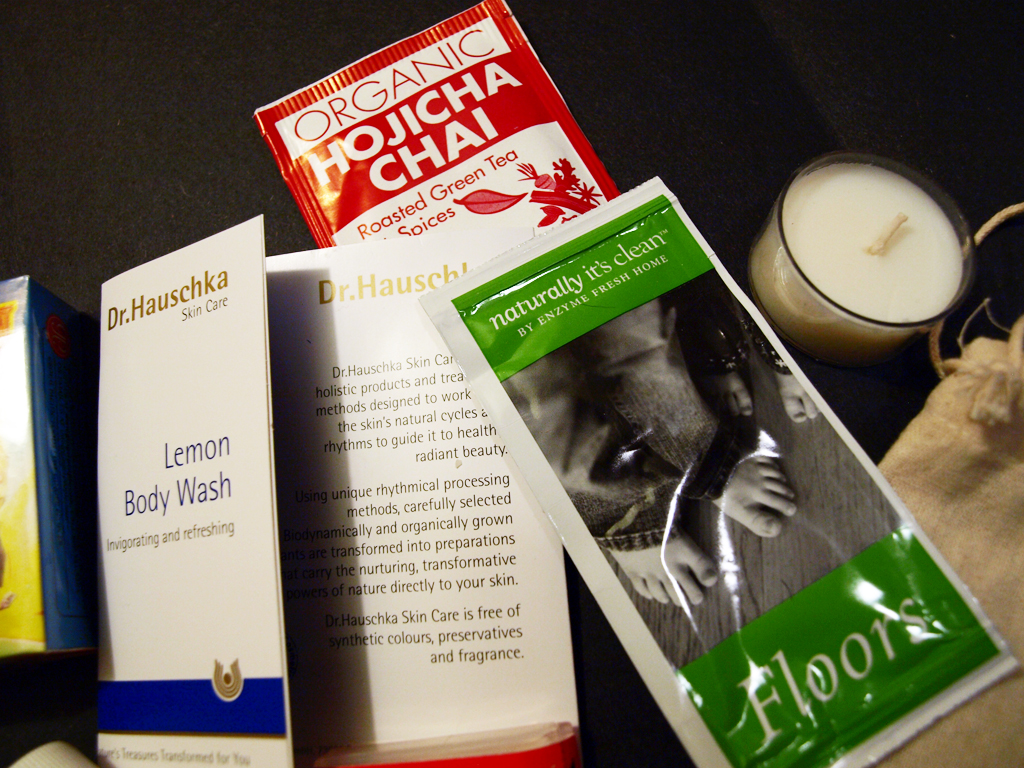 I had a hectic and frustrating day at work yesterday, which made coming home to my Eco-Emi Bonus Box even more exciting.  I’ve blogged about my monthly boxes before, but this one is a bit different.  Every few months they sell a “bonus box” that has more than the regular amount of items and is a one-time sale.  So even people who aren’t subscribers can pick one up.  It’s a great way to try out the service (which brings you eco-friendly samples and products each month for $15/month) without the commitment, although since they are so infrequently offered you’d have to get lucky and catch them at the right time.