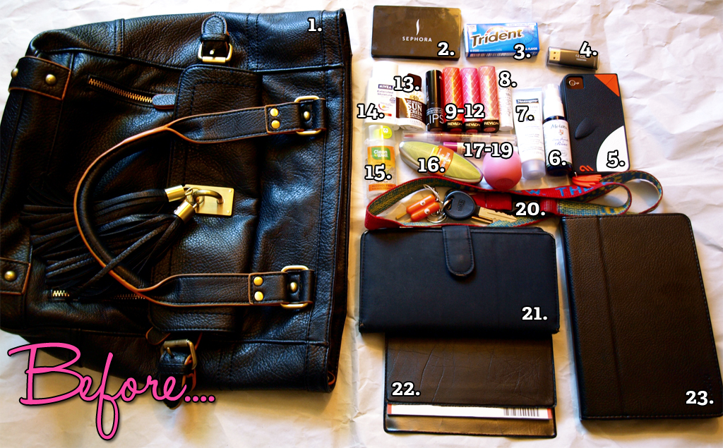I went from 23 to 14 items, which was definitely a big transition for me.  After lugging around huge purses for so long, I thought I wouldn’t be able to function without so much crap, but I was wrong.  I feel almost liberated to be carrying around such a small purse!  My back thanks me, too.