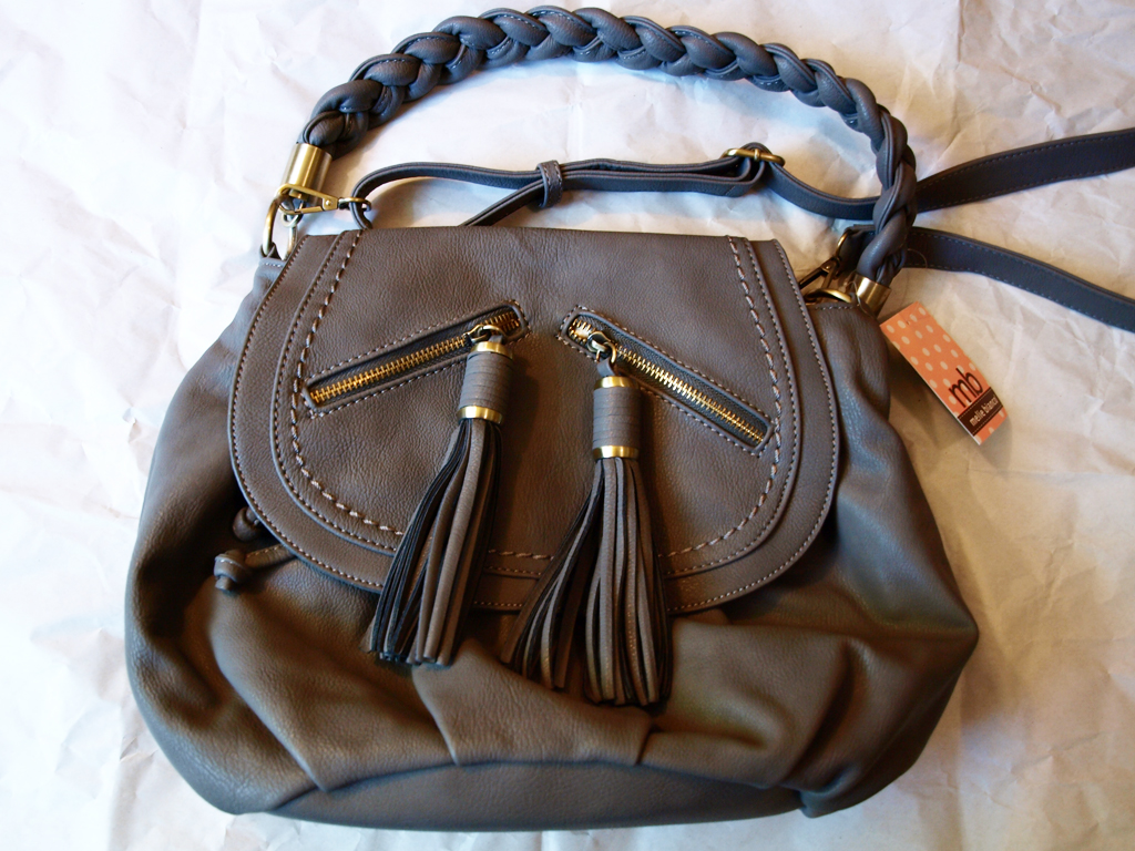 The item I opened with was this Melie Bianco Molly Braided Flap Over Bag.  I like to open with a purse that I really love, that way I know I’m at least getting something I want that I would pay $60 for.  I originally picked the black one to start with, but I traded between the black, taupe, and tan quite a bit before settling on the taupe.  I’m going to be that girl and say “It doesn’t match the color on the website at all!”  But it really doesn’t.  On the site it appears to be much lighter, and it’s really a dark blue/gray.