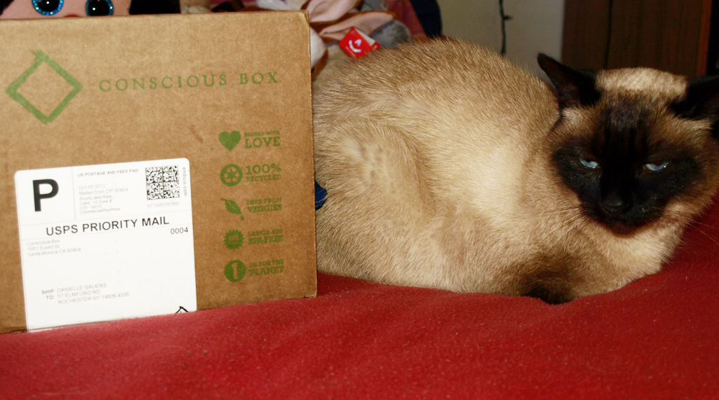 October’s Conscious Box was full of goodies for me to eat.  I like when they send boxes that are mostly edibles because then I can eat them and be done with it and not have more samples hogging up space around my room.