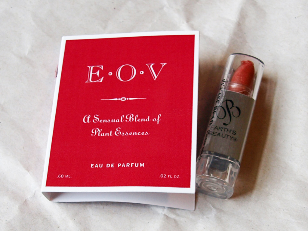 • Essence of Vali E.O.V. Perfume – A little perfume vial was included in the orange package in the upper left corner.  It’s the brand’s signature blend, which was created over 10 years ago for a private client.  I like that it has minimal ingredients (SDA 40B, essential oils, and water), but I didn’t care for the scent.  It smells slightly citrus-y, but more appropriate for an older woman I think (no offense is meant by that, it’s just the best way I can think to describe it).