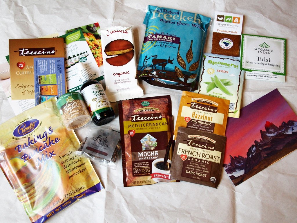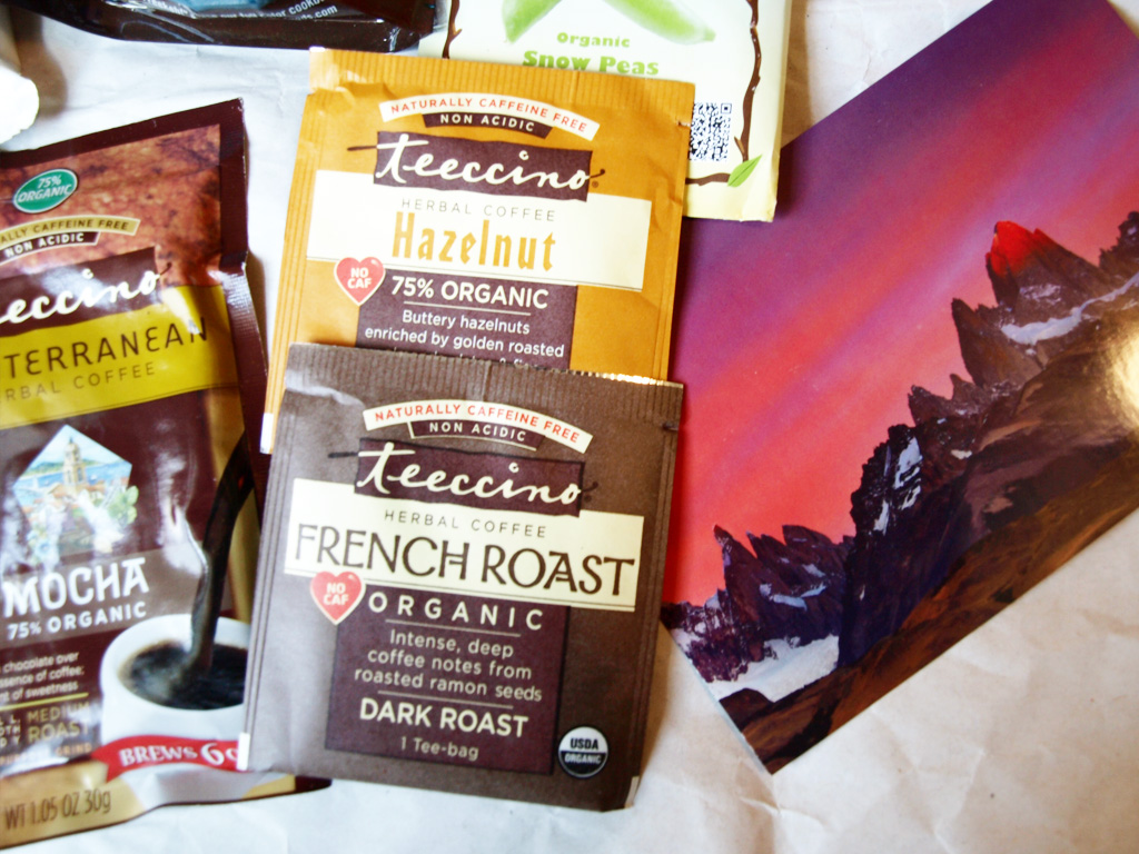 - Teeccino Herbal Coffee – There were three Teeccino products total, but the one in this photo is a bag of the 75% Organic Mocha flavor. I don’t really understand what this is supposed to do — it’s “naturally caffeine free,” but is supposed to replace coffee. I drink coffee for the caffeine, so I’m hoping that this gives me the same boost. Oh well, I’m willing to try it.
