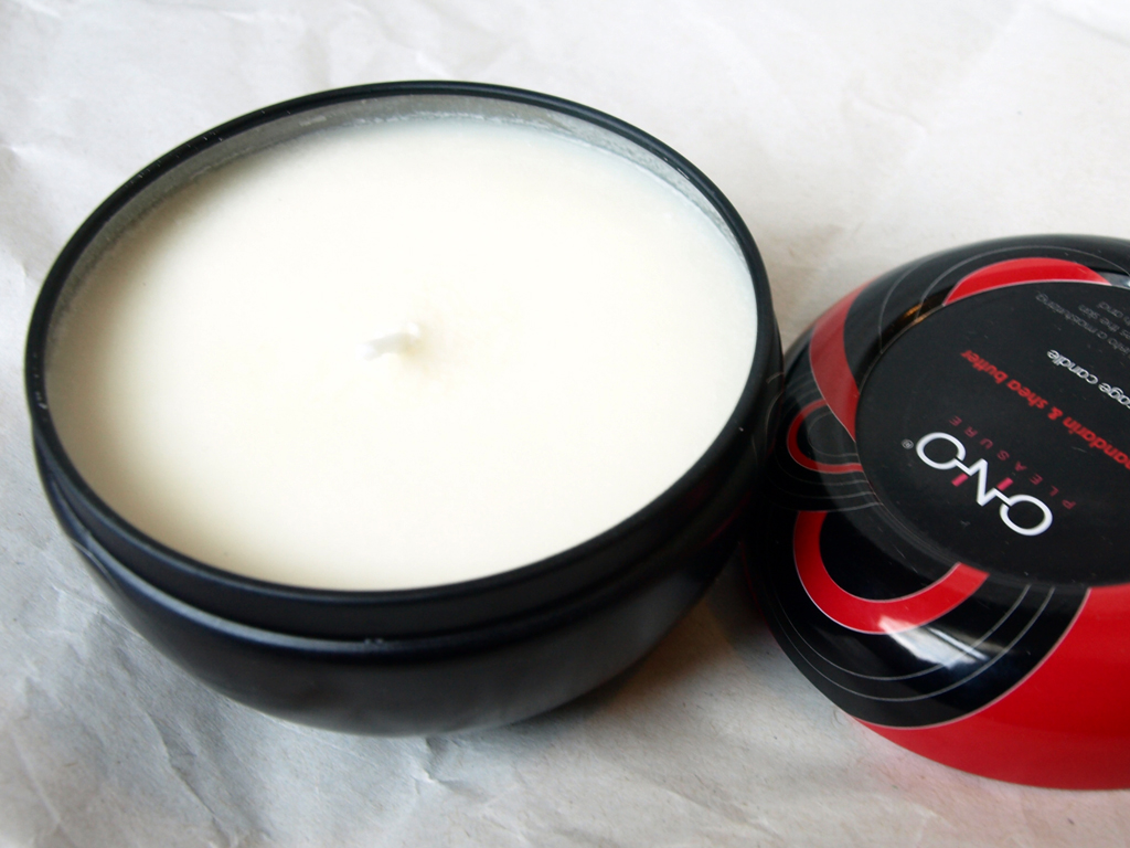 First up is the Ono Pleasure Massage Candle in Red Mandarin & Shea Butter.  I’m a total candle hoarder, and I chose to try this one because I’ve never tried a massage candle before.  The way they work is that the waxes transform into a moisturizing body oil as you burn it, and you can then use the oils to moisturize the skin or for a massage.  The scent of this candle in particular is very bright and citrus-y; I really enjoyed it.  I wish that the scent was a little bit stronger while burning, but I suppose since the oils are meant to be used on the skin you wouldn’t want it to be too strong.