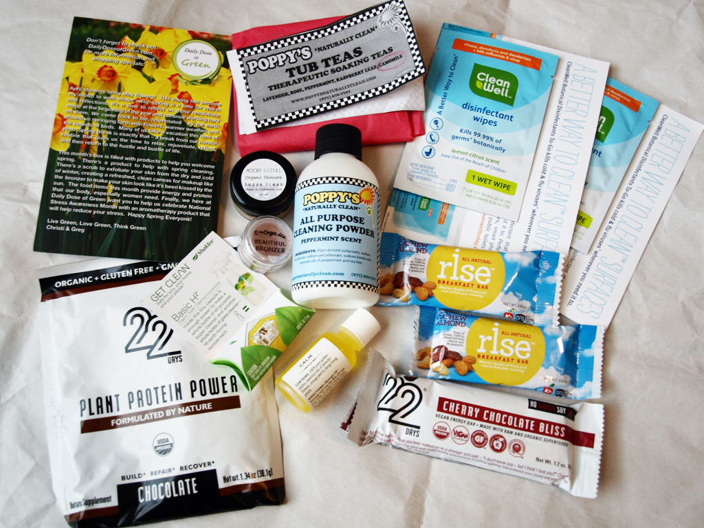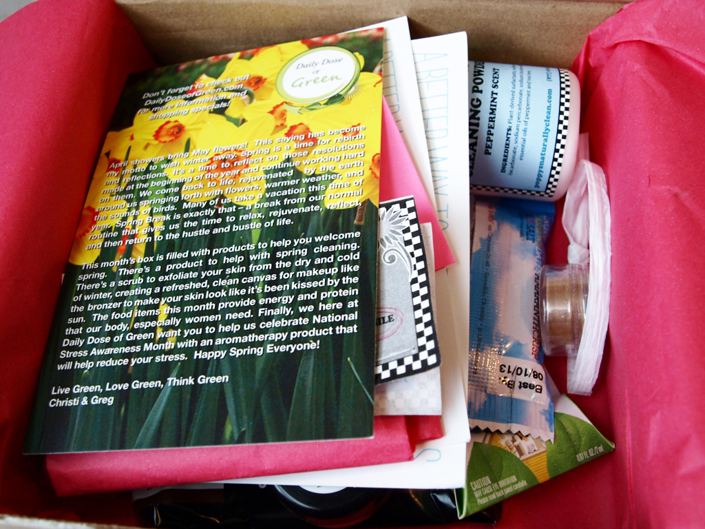 April’s Daily Dose of Green was another great box. I have been consistently impressed with this subscription, so I’m so glad that I found it — or rather, they found me. They send 8-10 eco-friendly lifestyle items for $15/month (shipping included), some of which are tailored to your interests via your user profile that you fill out once you become a member.