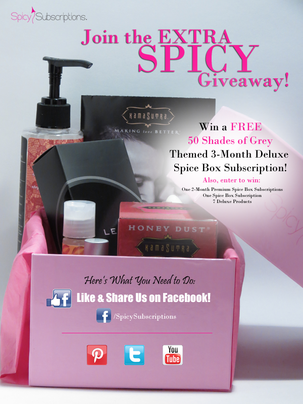 I’ve reviewed Spicy Subscriptions quite a few times here (read my reviews), and I think they have been a pretty popular subscription with my readers (based on the sign-ups I’ve received through my referral coupon). I’m glad that so many people have found the reviews useful! If you’ve been wanting to try Spicy Subscriptions for yourself, here is a great chance — they are running a giveaway for a 3-month subscription of their fabulous 50 Shades of Grey deluxe themed boxes!