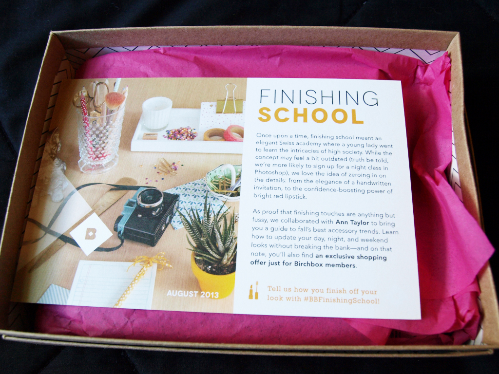 This month’s Birchbox theme was Finishing School, which I thought was interesting because last August’s was Beauty School. School is on everyone’s mind come August, so I know it’s a common theme, but I still found the similarities intriguing.