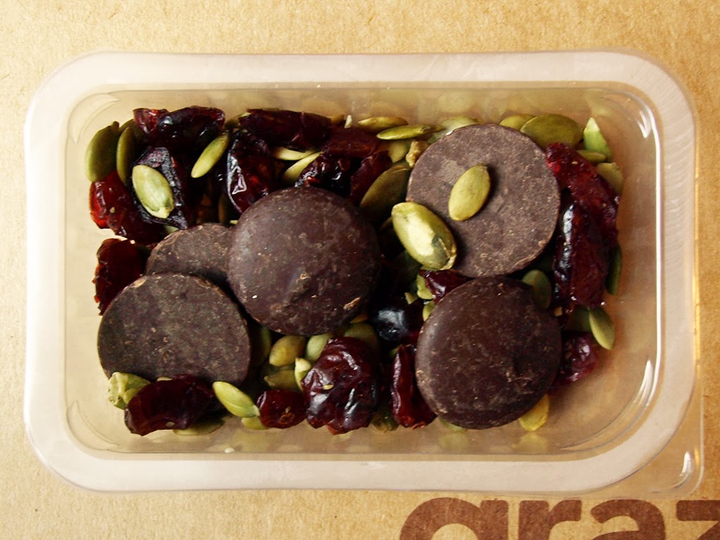 My last snack was simply called Florentine. It was a mixture of dark chocolate buttons, pumpkin seeds, and cranberries. I think Graze wanted to send me as many chocolate snacks as they could before they became unavailable again (all three of these are only available in the fall), and I’m not complaining. Much like the Honeycomb Crunch, I found this to be a great mixture when eaten all together. It was hard for me not to just eat the dark chocolate buttons by themselves, but they definitely were even better when paired with the crunch of the seeds and the tart, chewy cranberries.