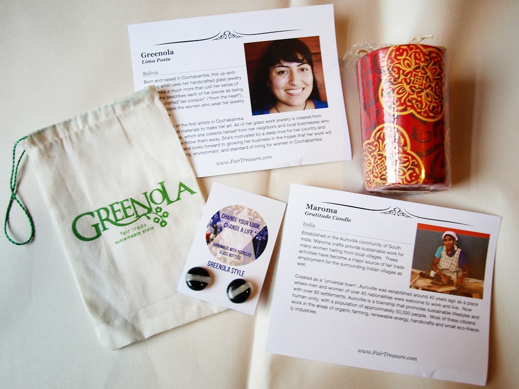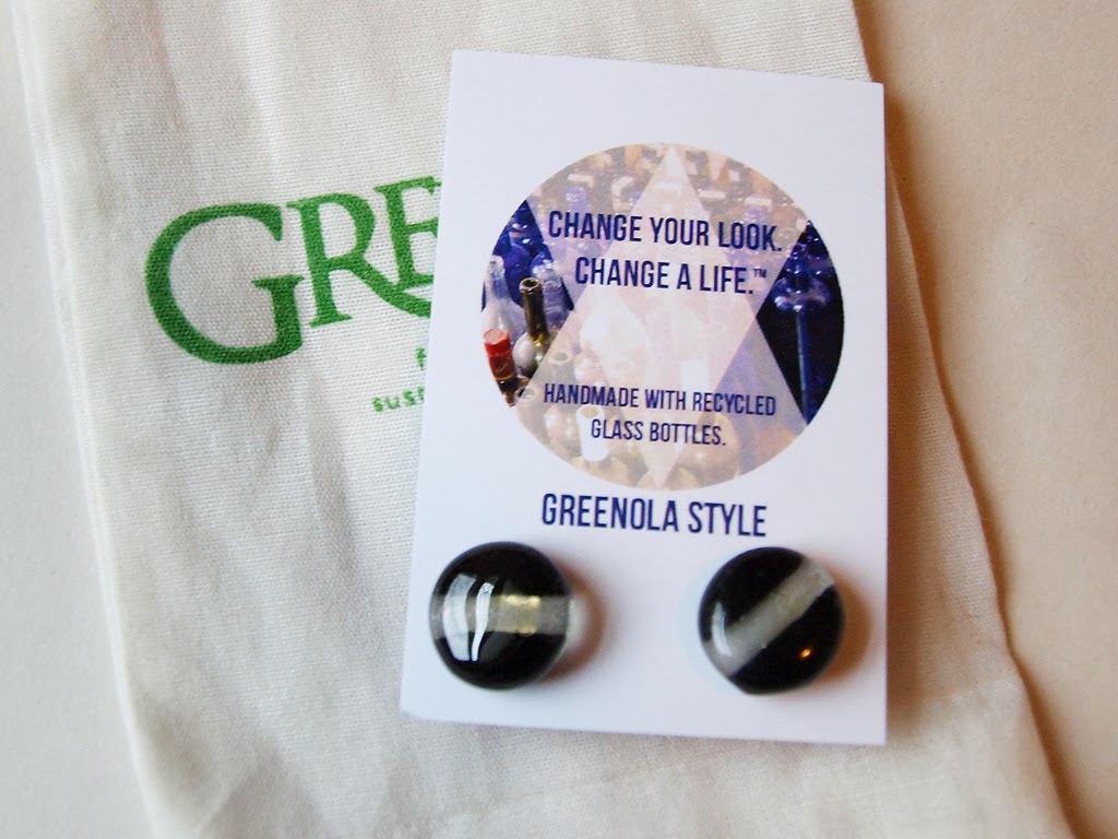 These Lima Posts earrings from Greenola are made entirely from recycled materials. Karina of Cochabamba, Bolivia, crafts all of her glass work jewelry from recycled bottles that she collects herself from neighbors and local businesses. I love that she’s creating something beautiful from recycled materials, since environmentalism is another issue I feel passionately about. These earrings aren’t normally a style I would choose for myself, but I really do like them and I’m glad I received something new to try!