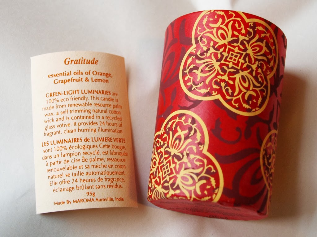 This Gratitude Candle by Maroma is from the Auroville community of South India. Auroville was established as a “universal town” around 40 years ago where men and women of various nationalities could come together to work and live. There are now approximately 50,000 people working in Auroville. Maroma crafts provide women of the area with sustainable work, and many of the citizens work in areas of organic farming, renewable energy, and eco-friendly industries. This candle contains essential oils of orange, grapefruit and lemon, creating a wonderful citrus aroma. I’m also in love with the gorgeous detailing on the packaging!