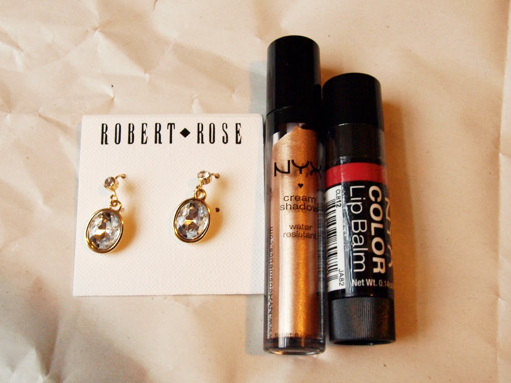 If these Robert Rose Oval Stone Drop Earrings look familiar, it’s because I shipped the silver pair in the my December bag. I would have preferred to get something different, but again, trading was moving really slowly and no one wanted to trade me anything for them. I also got the NYX extras in the two colors I wanted the most, so that was good. The lip balm is in the shade “Shukran” and the eyeshadow is “Suede.” I don’t care for the cream eyeshadow because it dries too quickly and feels like glue once it’s dried, but I like the lip balm.