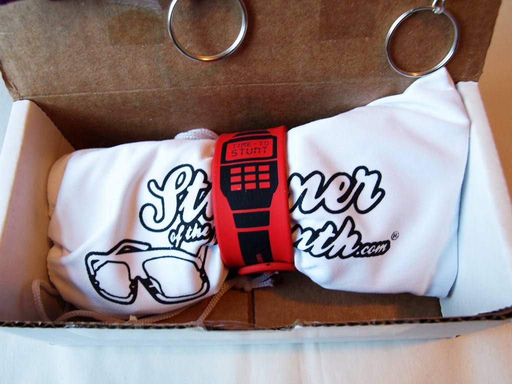 Here’s the full spread of extras I received, as well as the glasses themselves up at the top.  All in all, the package included the slap bracelet, a bunch of stickers, a bottle opener, a button, and an eyeglass screwdriver.  I was actually most thankful for the screwdriver because I’m a wearer of regular glasses as well and I was in need of one.