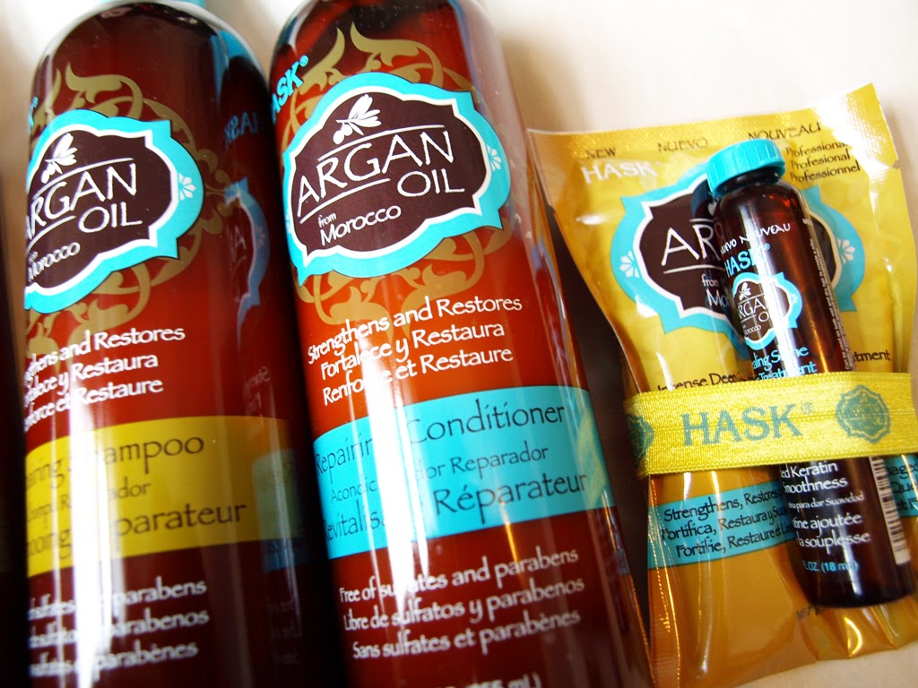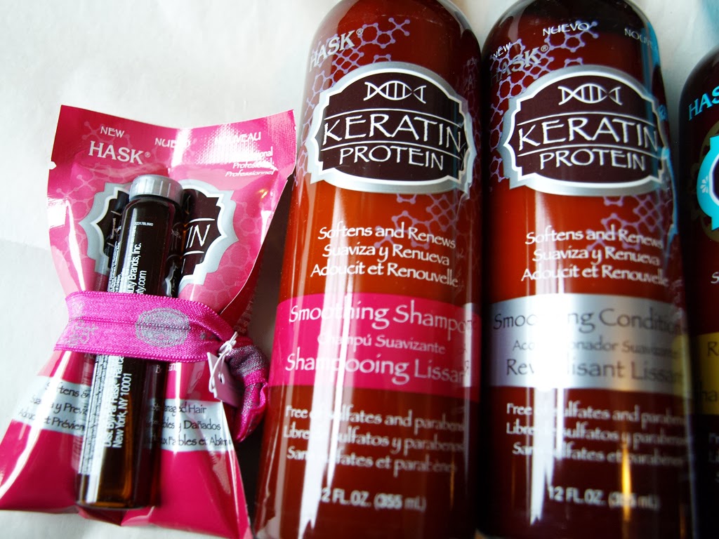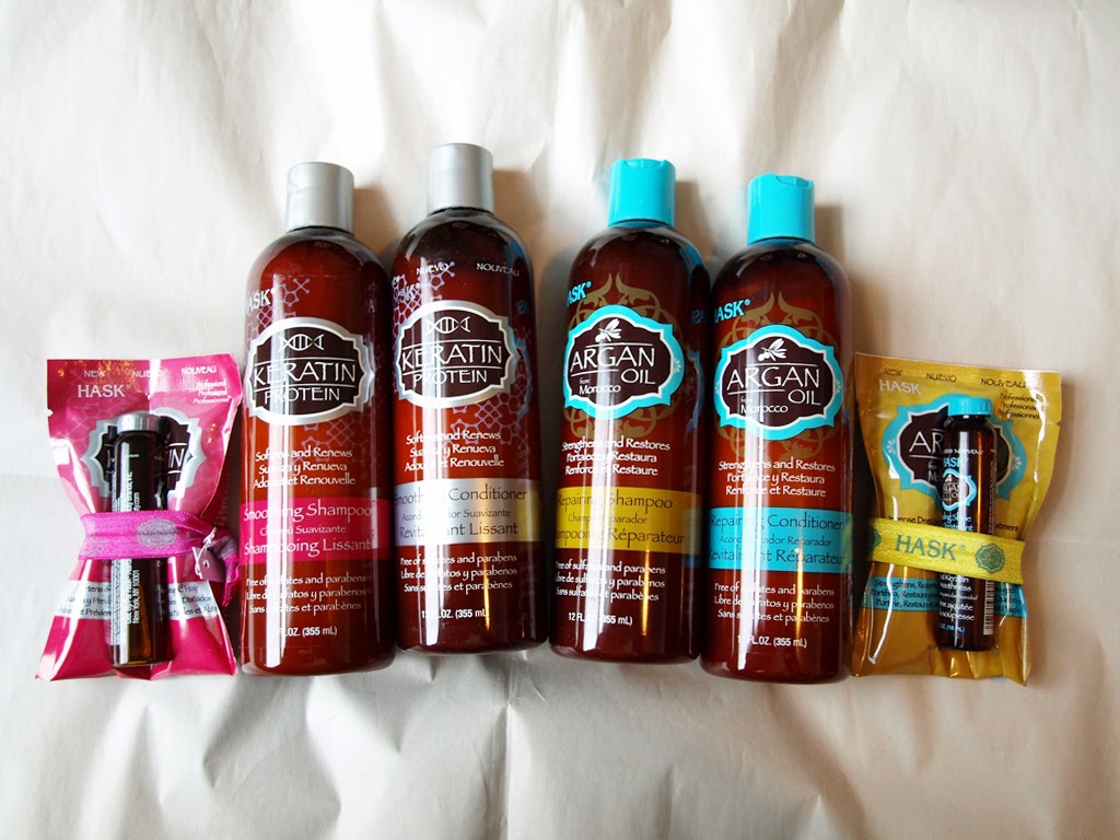Hask sent me a total of eight different products to try, along with two Twistbands and a shower caddy (not pictured). The products on the left are from the Keratin Protein line, and the ones on the right are from their Argan Oil line. I was so excited to try these because I’ve used argan oil before, but never keratin, and of course I was curious to see what the results of both would be.