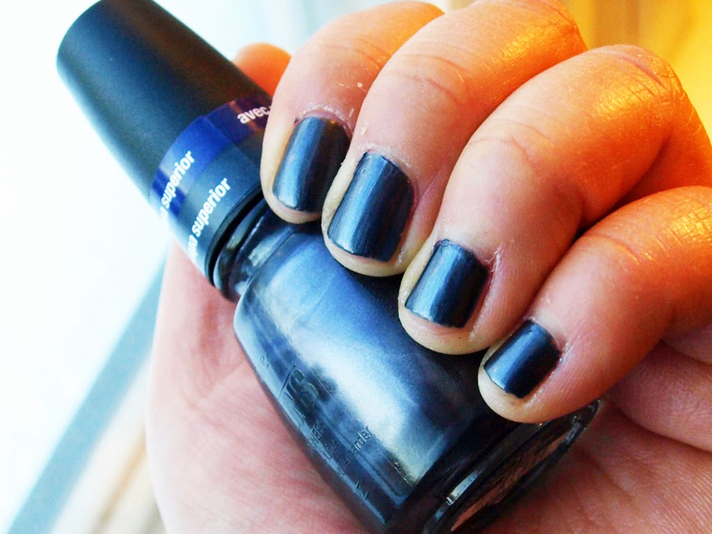 The first and third nails (from left to right) are painted with a top coat, and the second and fourth are not. I think the top coat blue/purple shade is most apparent in the first nail, and you can see in the second nail that without the top coat the polish is more gray.