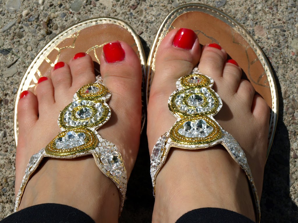 Here’s a picture of me wearing the sandals.  Since you obviously can’t see them in as much detail in this shot, I made sure to take an up-close photo as well.  They also have a very light snake-print detail along the sides of the strap, which I really like.  I got them in a size 6 and they fit perfectly.  Normally I wear a 5 1/2, so I would recommend buying these a half-size up if you’re interested in them as I think they would be a bit too snug in a 5 1/2 (if that size existed).  They are available from size 6 to 11, with some half sizes.