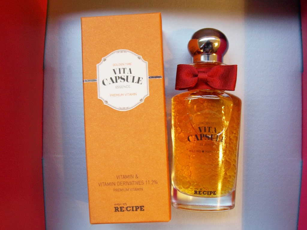 - Recipe by Nature Golden Time Vita Capsule Essence ($42 for 40 mL) – This is a full-sized “vitamin essence” that I think is essentially a facial serum. It is “packed full of vitamin capsules that will deliver deep nourishment and nutrition to your skin,” according to the description on the box’s informational card. It works to balance oil levels, brighten the skin, and even out rough textures. When I first used it I only used a drop or two, but even that felt too heavy on my skin, so I found that this should be used very sparingly.