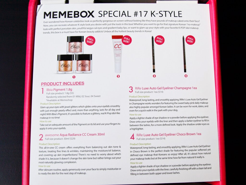 There are two main types of boxes, the standard Memebox and the Superbox. Memeboxes contain four to seven full-sized products and deluxe samples, and Superboxes contain full-sized products only. Both are often centered around a theme, and the box that I’m reviewing here is Memebox Special #17: K-Style.