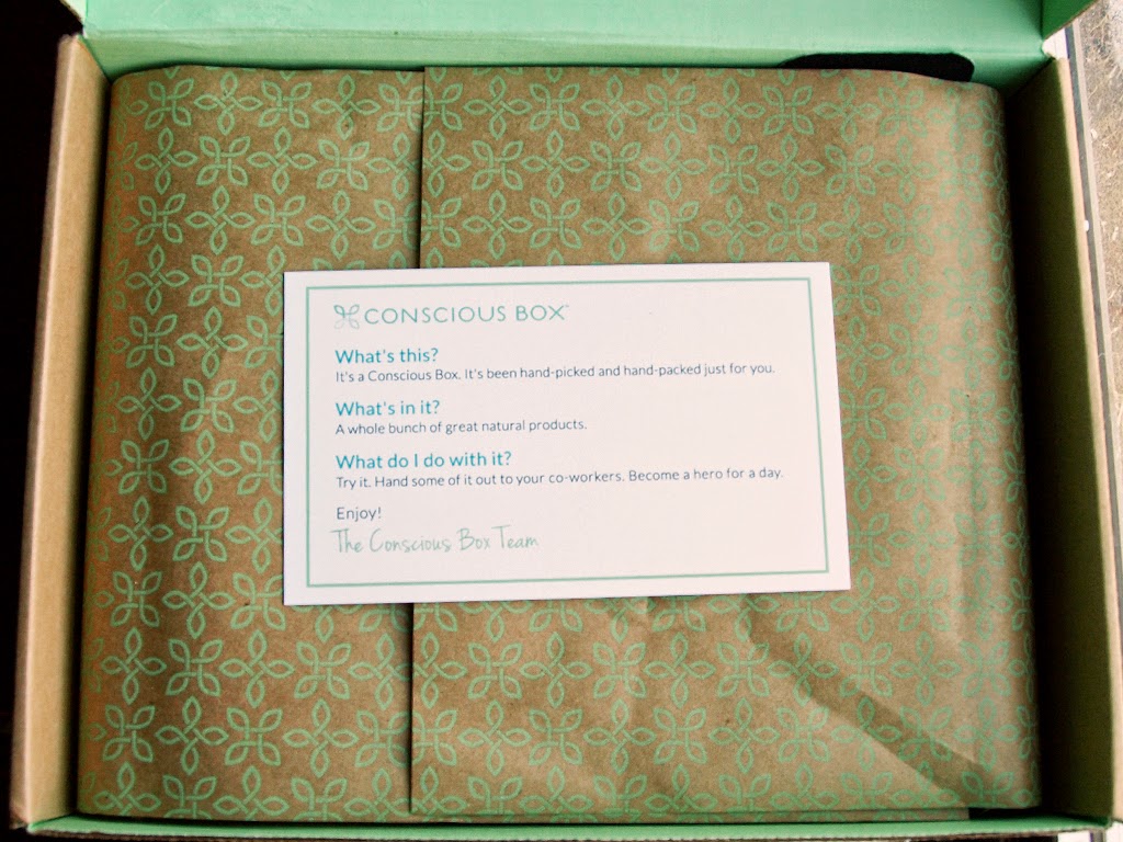 The contents of the box were wrapped in tissue paper adorned with the Conscious Box logo, with a card on top with a quick rundown of what the box is all about. Towards the tail-end of my subscription a few years ago, I recall that they stopped sending full informational cards that listed all of the products, and instead emailed the information to their subscribers. I’m assuming they’re still doing that, since there was no product card in the box.