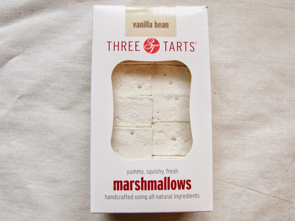The Three Tarts Vanilla Bean Marshmallows ($9.50 for 10 marshmallows) were included to go with the hot chocolate.  I sampled the Cinnamon variety in last year’s Snow Day Birchbox and thoroughly enjoyed them, so I was glad a full-sized box was included here.  The mallows are very big, about an inch wide and an inch-and-a-half tall, so I break them in two and only add one half to my drink.  The only ingredients are sugar, glucose (which is sugar, so that seems redundant?), gelatin, vanilla bean paste, and corn starch.  I could do without the gelatin, but these taste pretty good regardless.
