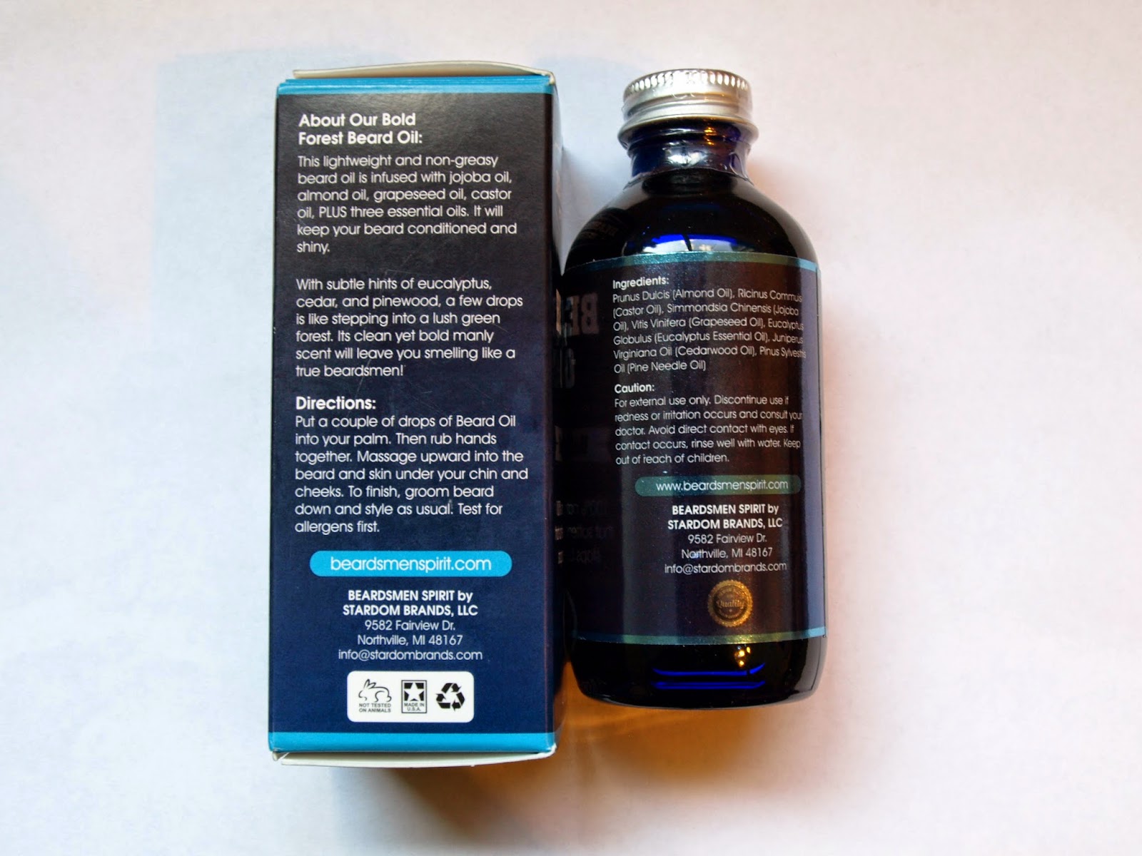The label says that “a few drops is like stepping into a lush green forest. Its clean yet bold manly scent will leave you smelling like a true beardsman!”