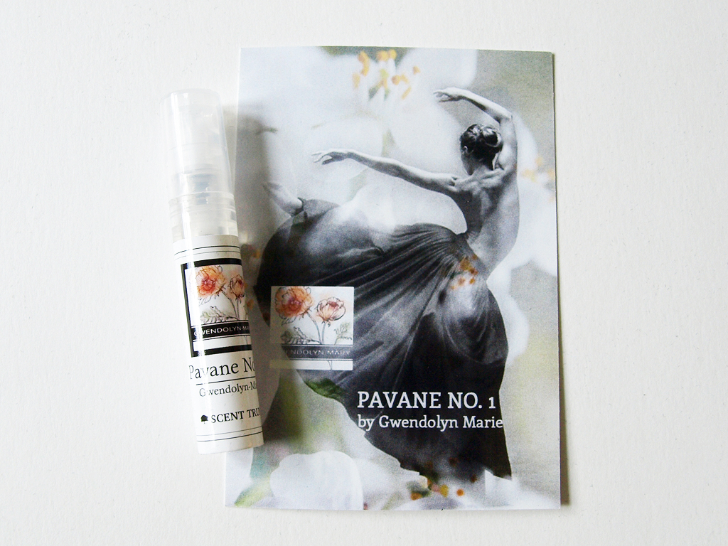 Last up is Pavane No. 1 by Gwendolyn Marie. I also received this in my last box. It’s a beautiful perfume with top notes of orange blossom, middles of fresh grass, and a base of fig and litchi. The top note is kind of floral for me, but the middle and base notes mix really well with my skin’s chemistry and I just love how it smells!