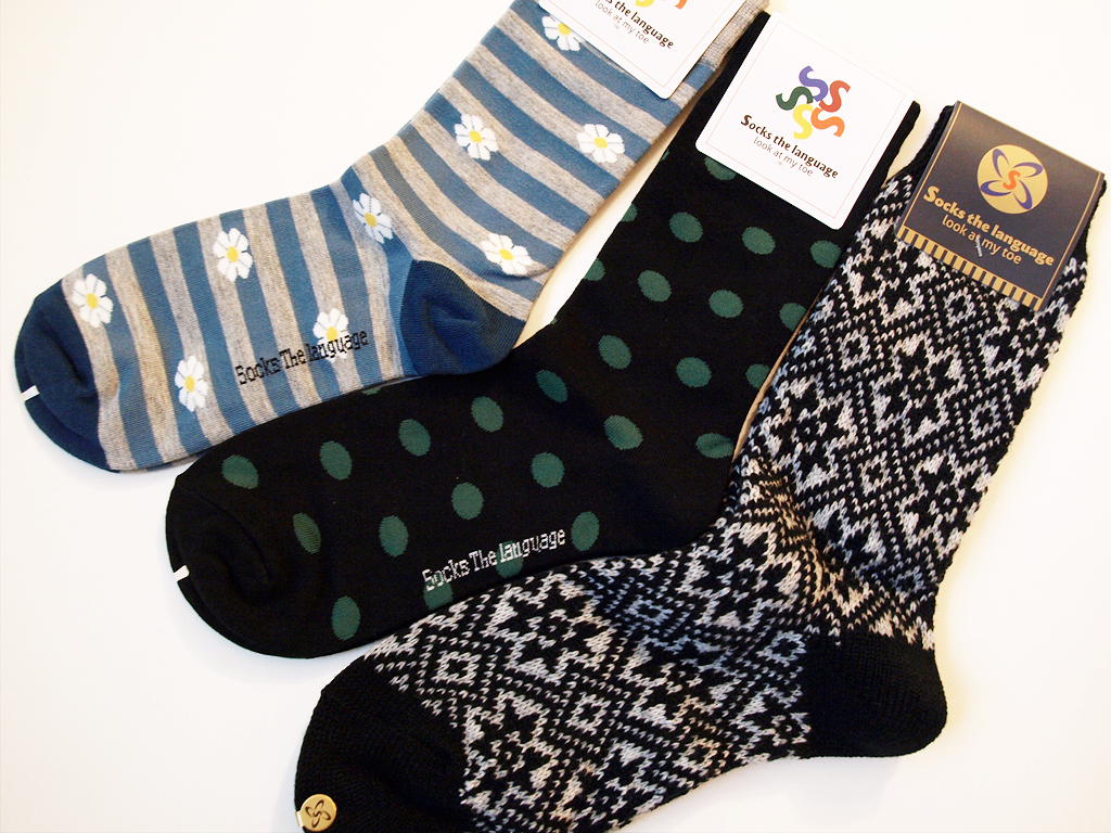 I received two pairs of women’s fashion socks and one pair of (what I think are) wool socks. They are all from the brand “Socks The Language” and are mid-calf length. I like tall socks, especially ones with fun patterns, because my feet are always cold and they’re fun to wear when I’m lounging around. They’re also nice to wear with tall boots during the fall and winter.