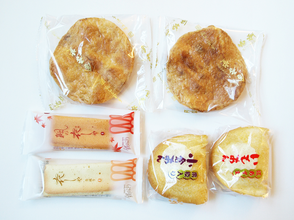 - Mame Yakko – These are the three white/clear packaged treats on the left hand side of the photo. The snack in the red packaging is actually one of the Kinesha cookies; I accidentally included it in this photo instead of with the other Kinesha. Anyway, the Mame Yakko are made by a small shop in the Ginza neighborhood and are made from a mixture of edamame beans and rice. The cracker is doused in a secret broth before it’s baked, lending a crisp, clean, savory finish. These have a great crunch and tasted great! The flavors include edamame, spicy dashi broth, and traditional roasted kinako soybean.
