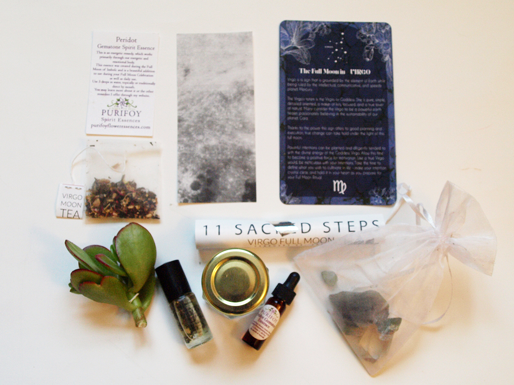 This box was for the Virgo full moon that occurred on February 22nd. This moon had a lot of significance for me because my moon sign is actually in Virgo. If you’re not familiar with astrology, you have your sun sign, which is generally the sign that people refer to. I’m a Capricorn because I was born December 28th, but there are also rising signs (mine is Aries) and moon signs. You can learn more about that with a quick search, but I wanted to explain for anyone who wasn’t familiar.