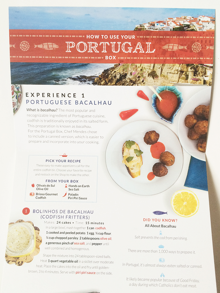 Each box contains a foldout Culture Guide that has a ton of information about the featured destination and the items inside the box. It also contains suggestions on how to use your box. This month’s card had two experiences, one for Portuguese Bacalhau and one for After-Dinner Treats! The card is much bigger than the photos above (it folds out to five sections and is double-sided), but I wanted to show close-ups so you could get a glimpse of what information is on it.