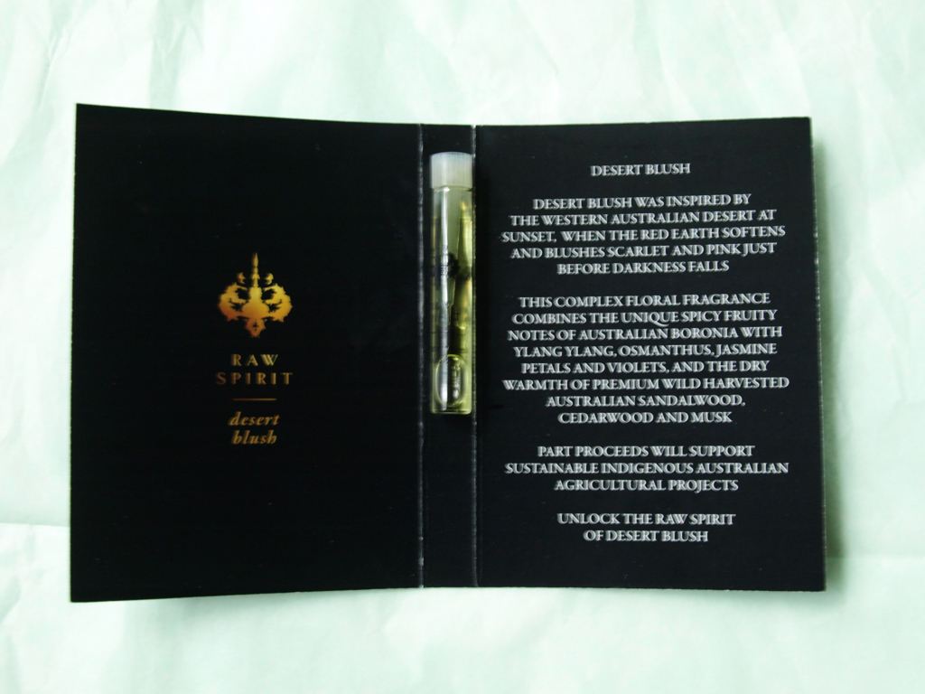 - Raw Spirit Desert Blush – This smells so amazing! It was the only perfume sample to choose from that I hadn’t already tried and I’m so glad I picked it up. It’s a floral with notes of Australian Boronia, ylang ylang, osmanthus, jasmine petals, and violets. It’s also spicy, with Australian sandalwood, cedarwood, and musk. I don’t usually like florals, but the warm spicy notes in this make it perfect.