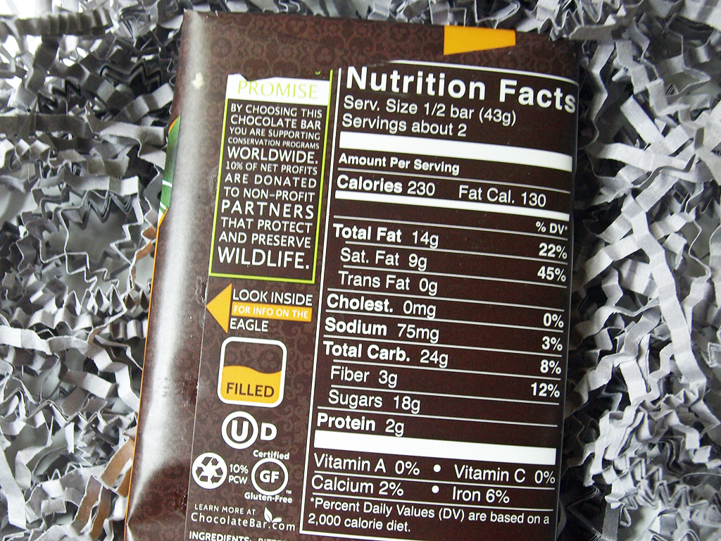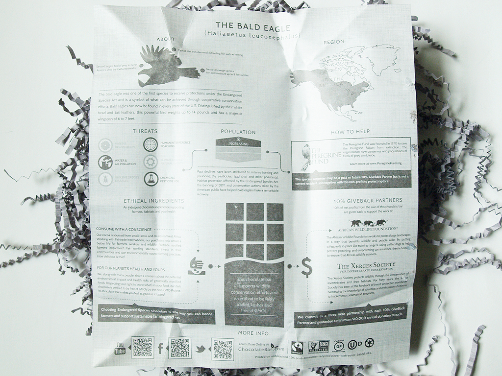 The wrapper features a Bald Eagle on the front, and inside there’s information about the species and the Endangered Species Chocolate 10% GiveBack partners.