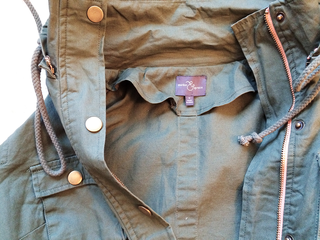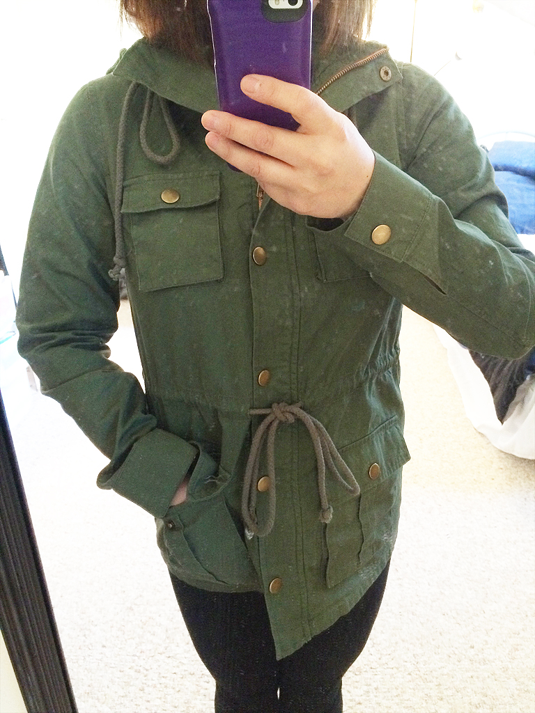 I love this jacket so much. Sorry for the crappy quality of the photo above, but I live alone and it’s hard for me to take pictures of myself in clothes with my DSLR. This still gives you a good idea of what it looks like and how it fits. I love all the pockets, and the material is warm enough for chillier spring days, but it isn’t too thick, either. The hood is also nice and actually stays on my head (I hate when it’s windy out and the hood just blows right off).