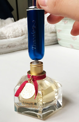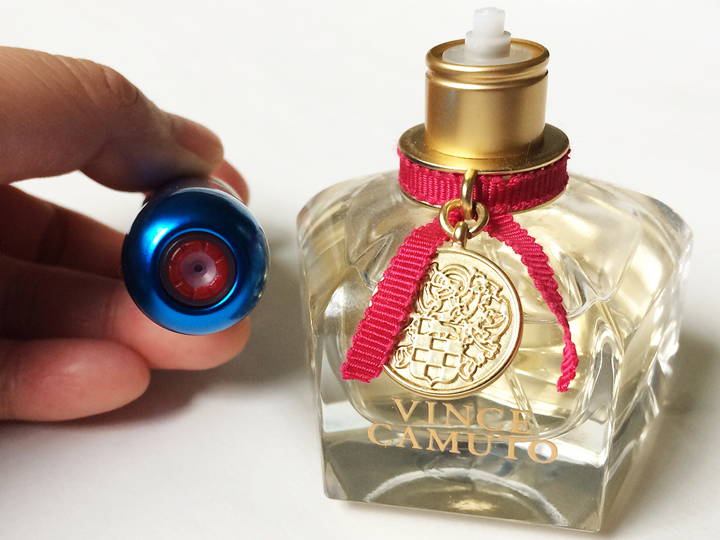I used my Vince Camuto perfume to try this out. At first I wasn’t quite sure how to fill it up and the instructions on the side of the packaging were kind of vague (just pictures, no written instructions), but after a few minutes I realized that the bottom of the unit has a connection that you place on top of your perfume. You’ll have to remove the cap of your perfume like in the photo above, but you just press the bottom of the Travalo onto your perfume bottle and keep pumping until the bottle is full. You can watch your progress in the window on the side.