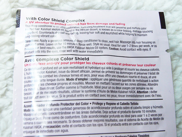 I have highlighted hair and I want to protect and keep the color for as long as I can, since good highlights are quite an investment! HASK uses kalahari melon oil to protect color-treated hair from damage and fading caused by washing and heat styling (both of which I do daily).