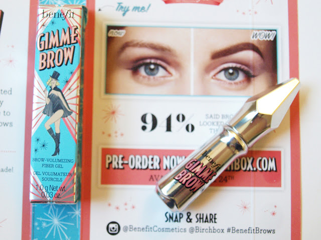 - benefit Gimme Brow Volumizing Fiber Gel – benefit is launching a new line of brow products and this was an exclusive pre-release just for Birchbox subscribers. I chose shade 5, the deepest option, for my sample choice and it matched my brows perfectly. This is exactly what it sounds like, it has a little brush at the end and is mascara-like; you brush it over your brows to add more volume and fullness. My brows are small and thin due to overplucking years ago and this adds a good amount of filler.
