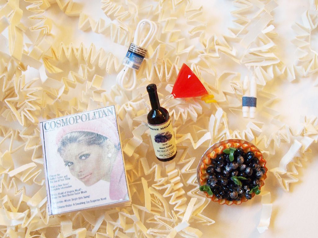 And here they are! I probably should have included a quarter or something for scale, but trust me when I say these are all pretty small (1/12th scale, as noted previously). The only one that would come close to being the same size as a quarter would be the Cosmopolitan replica. Here’s everything that was included, clockwise from top: