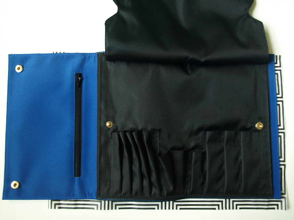 The BO brush organizer is also available in vinyl and leather. It has enough space to fit your cell phone, credit cards, money, and, of course, your brushes! I like how sleek it looks and that it easily folds up to be more portable. The best part is that it snaps into the BOCO bag.