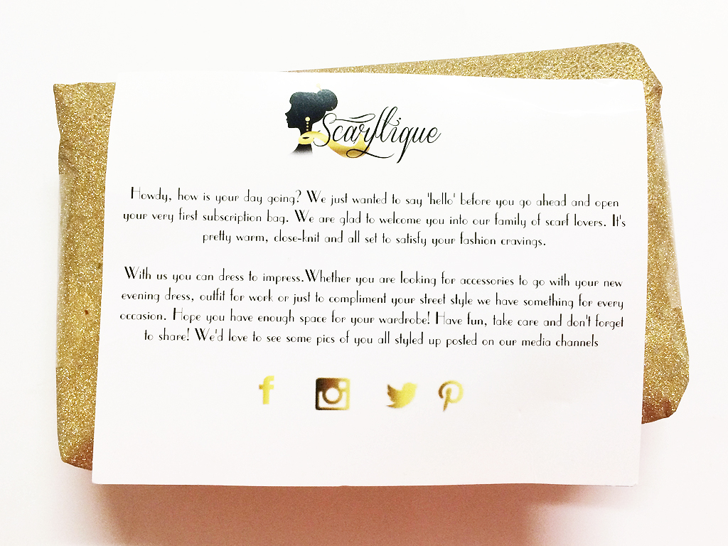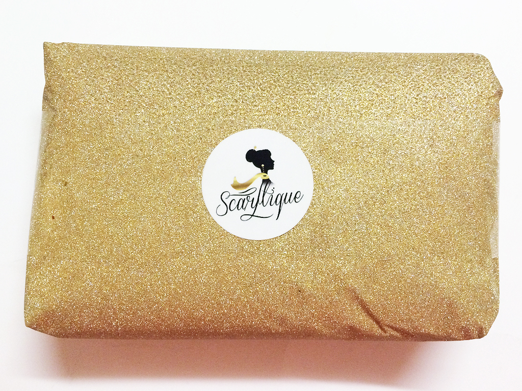 I love the beautiful gold paper that my scarf came wrapped in! This was shipped in a padded envelope with the gold package inside. I did not choose to add any extra items or accessories, so this is a review of the scarf only.
