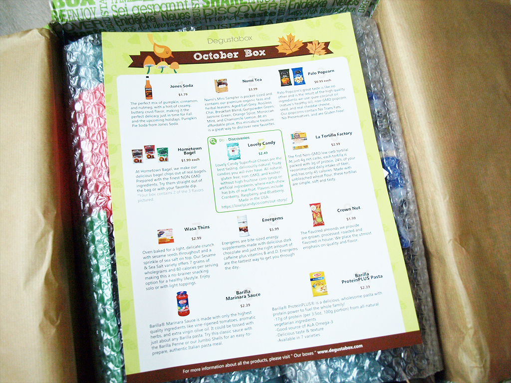Degustabox is big. It’s always packaged securely with plenty of bubble wrap to keep everything from breaking. I’ve never gotten a box that had a broken or leaking item.