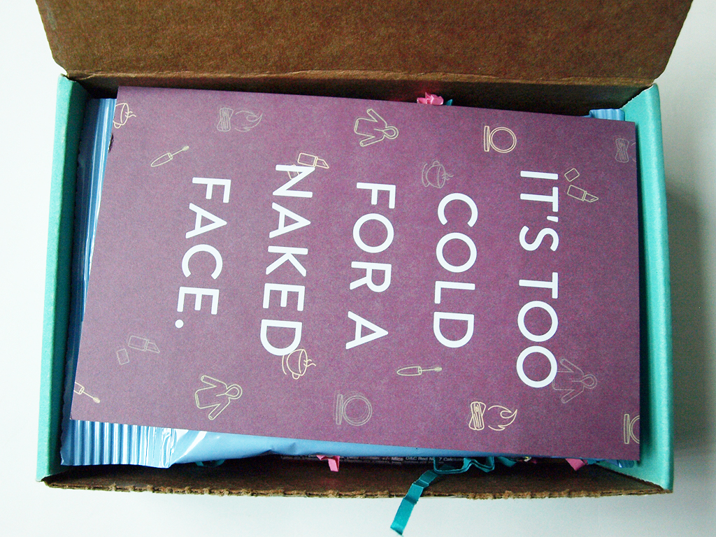 November is my favorite month because I love when the weather gets cold and the snow starts to fall. I know, I’m crazy! But I’ve just always loved the colder months. Luckily, Beauty Box 5 sent a great assortment of products this month, with the theme “It’s too cold for a naked face!”