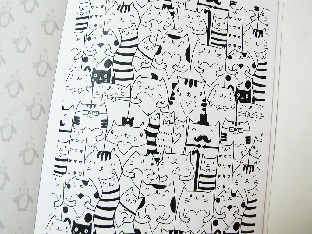My favorite page this month was this one with a bunch of cats on it! It’s really cute. I like that the book features a variety of designs, since you can color all different types of things. Some are more intricate than others, so if you’re not into crazy-detailed pages then there’s still something here for you.