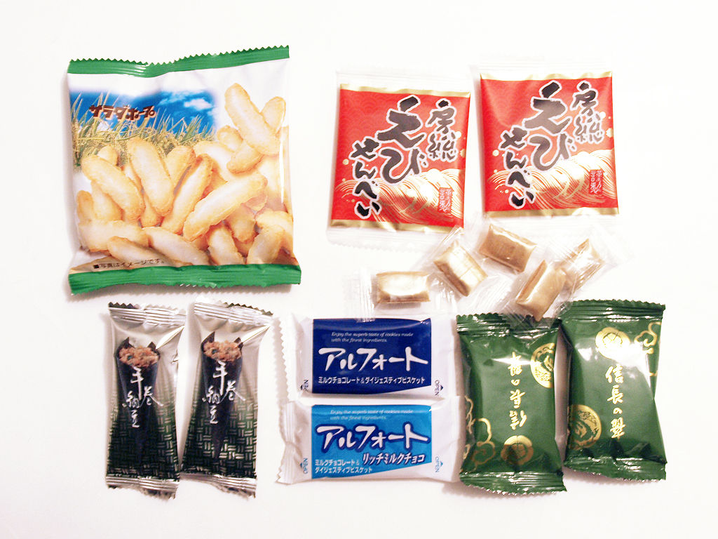 - Midori Nobunaga – Oops, I accidentally included these in the photo with the popular snacks below (bottom right hand corner). They’re a mini green tea castella cake made by a 60 year old snack shop. They use locally-grown Mino green tea from the rural Gifu region. The cakes were made popular by Oda Nobunaga, a famous Daimyo warlord from the 15th century who loved green tea and Portuguese castella cakes.