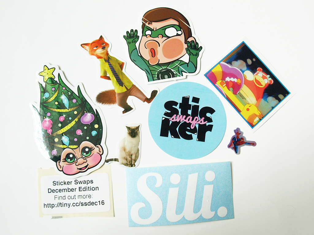 The other stickers are super random but that’s what I love about Sticker Swaps. I immediately noticed the Siamese cat because I have a Siamese cat, and I also loved the Pokemon and Zootopia ones. The Green Lantern one is pretty funny and the Troll and Spiderman are cute, too (Spiderman is cute because it’s small).