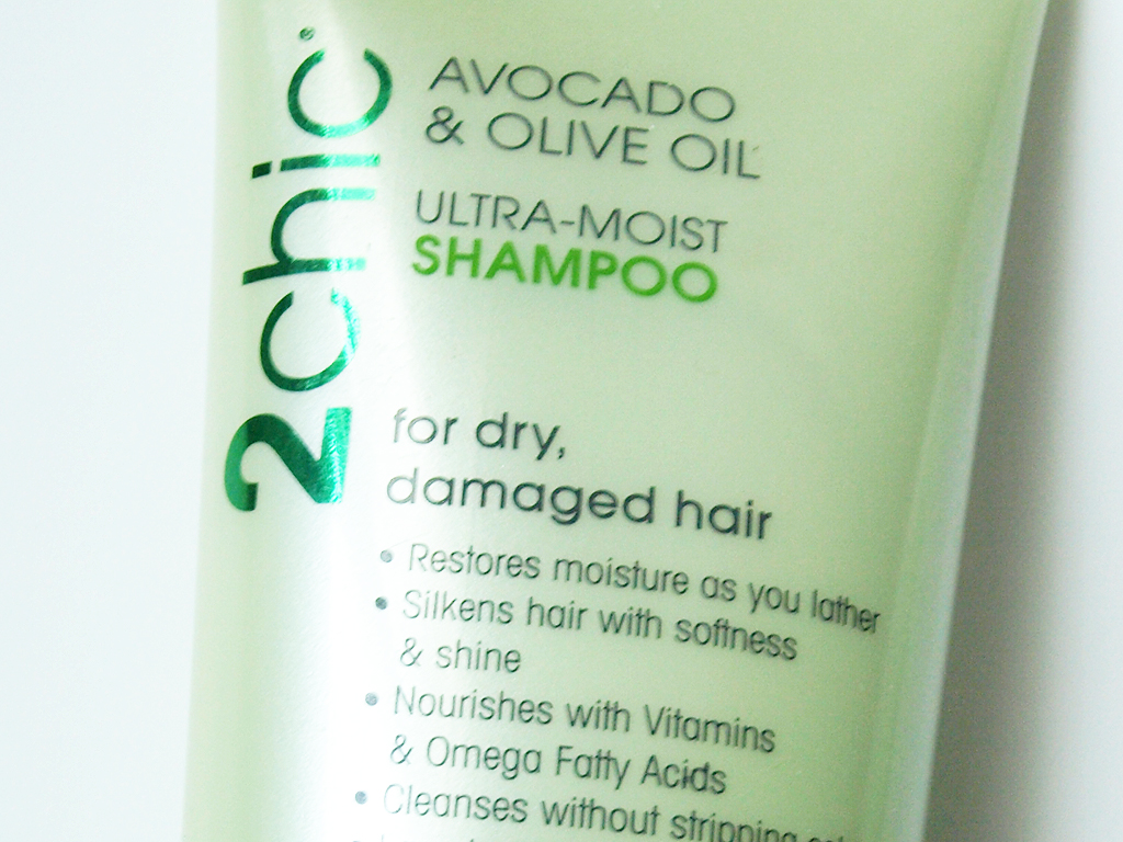 I received the Avocado and Olive Oil Ultra-Moist Shampoo and Conditioner and Blackberry and Coconut Milk Repairing Shampoo and Conditioner to try. There is also a Brazilian Keratin and Argan Oil Ultra-Sleek option in the 2chic line. I wanted to try the Ultra-Moist and Repairing options the most because my dry, heat-styled hair really needs some help.