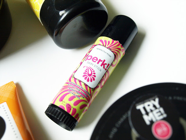 Next up we have the Perk! Skin Stick. Skin Sticks, as you can see, look like giant lip balms. We have 10 different ones available in this size, plus two giant ones and one for men (view them all here). Perk! is one I always have on hand because it’s great for headaches. It’s a shea butter base loaded with peppermint oil that helps relieve tension. When I feel a headache coming on I love to apply this to my temples. It immediately gives me a cooling sensation that really does help keep headaches at bay. It’s obviously not medicine so we’re not claiming it cures anything, but I find it to be helpful at soothing my headaches.