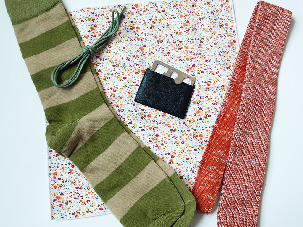 The tie is a red/orange woven design. Harrison Blake Apparel tends to send ties like these, but they do mix in more standard, non-woven ties here and there, too. The socks are gray and green striped with matching green shoelaces. I especially like the pattern on the pocket square. The small flowers are bright and colorful. My favorite part of this month’s set was the accessory, a multipurpose pocket survival tool.