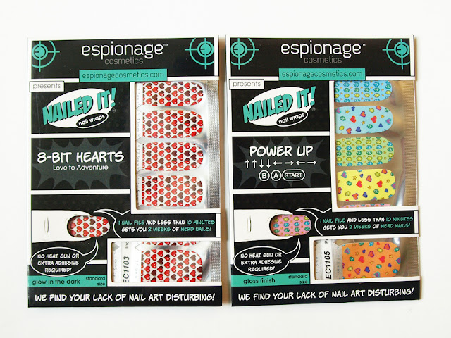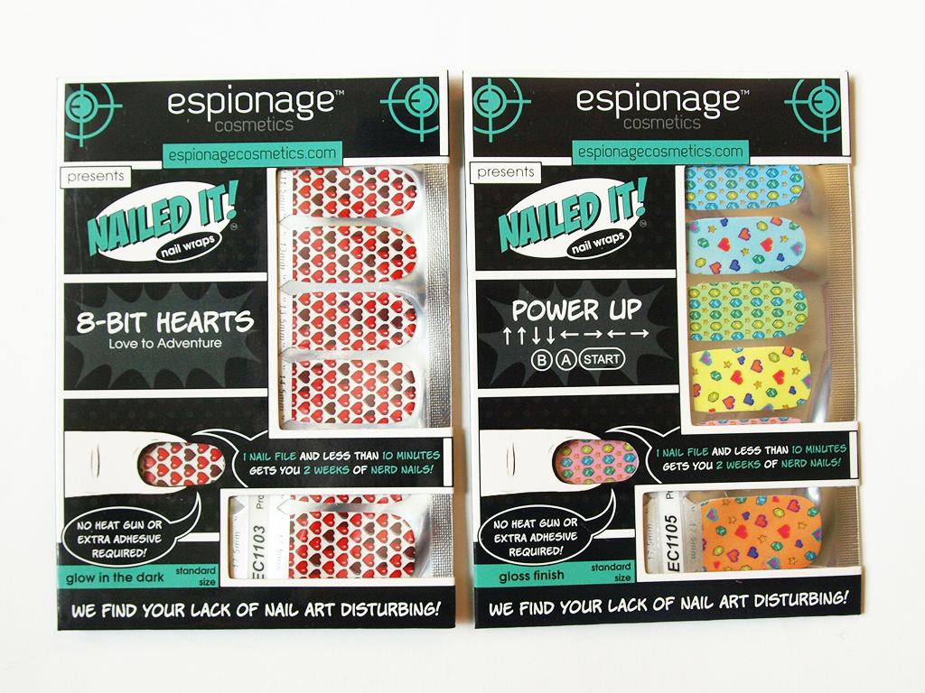 - 8-Bit Hearts Nail Wraps – These nail wraps will restore your HP and make your heart smile, according to the info card. The design is really cute and they’re also glow in the dark! I also like the “We find your lack of nail art disturbing” (Star Wars reference) on the bottom of the packaging.