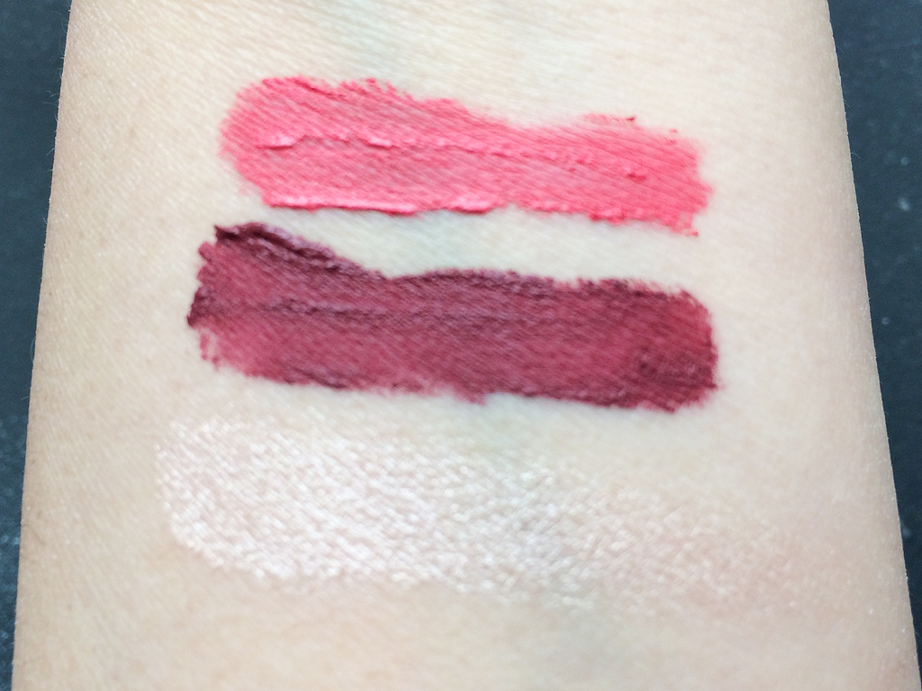 Here are the products swatched (top to bottom): Coral Fresh Lix Matte Liquid Lipstick, Berry Cool Lix Matte Liquid Lipstick, and Sculpt & Glow Highlighter Powder in Golden Sand.