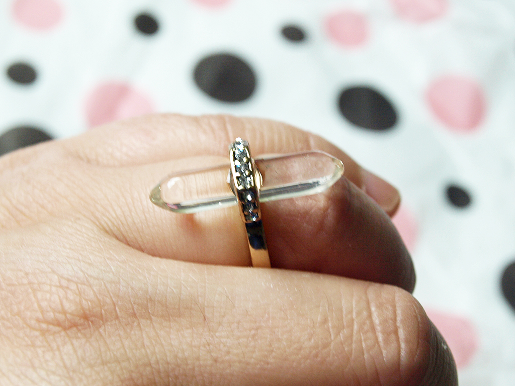 - Amber “Radiant” Gold Prism Ring ($49) – This ring is really interesting. The hexagon prism is bold and unique and is made of natural quartz. The small access stones are cubic zirconia. This is not something I would have picked out on my own but I’m glad that Cate and Chloe sends things that are outside of my usual comfort zone because I really like this!