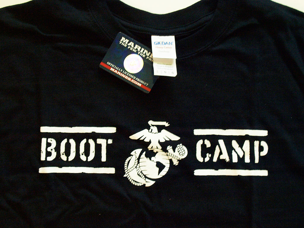 The Marine Corps t-shirt features the USMC Eagle, Globe, and Anchor logo with “Boot Camp” text. It’s all black with white lettering and I like the basic style.